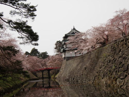 | さて今日は弘前城見学と五能線の旅。まだバスの始発前なのでタクシーで駅に向かう。運転手さんの話によると五所川原市の人口は合併をしたのでおよそ6万人とのこと。自分の町とあまり変わらない。7:36発、弘前8:26着の列車に乗った。 弘前駅は二度目なので懐かしい。ここからは循環バスに乗って城へ向かった。道路は連休中で結構混雑している。ユナちゃん(孫です!)への土産にするキティりんごストラップを買ってから、今回は以前に歩かなかったところを歩いてみようと徘徊。残念ながらまだ桜の満開には少し早いが、観光客や花見客・ボート遊びをする人、写生をする人などで賑わっていた。ここから見る岩木山は本当に美しい。さすがに津軽富士です。 |