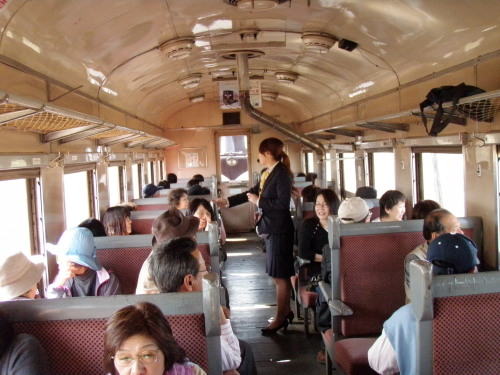 「はい…」。列車はテレビでお馴染みのストーブ列車。なるべくストーブに近い所へ席を取った。夏炉冬扇の感があるがそれよりも----私はあなたのそばが良い。 団体用の車両にはそれは美しいアテンダントさんが同乗して何やら説明をしている。こちらの車両といえば、土産販売のおやじさんが籠を持って回ってきた。自分は鉄ちゃんでは無いけれど(いつもそう言っているようにも思いますが)、一度乗りたいと思っていた列車に乗れて最高!。ゴトゴトと揺られながら、これがあのTVで見た列車かあ。冬ならこのストーブでスルメを焼いてもらえるんだな。しかし、もっと乗客が多いかと思っていたけど連休の割に少ないなあ。などと独りで思いを巡らしていると、前方の車両から籠を持ったおじさんが乗客に声を掛けながらやってくる。ストーブの枠に籠を載せて勧めると、先ず最初に買ったのはやはり女性でした。つられるように若い男性も買っている。私は先が長いのでパス。 車掌さんは若い男性で大変印象的でした。帽子のあごひも (あごベルトかな) をしっかりと顎に架けて、外すことはありませんでした。 津鉄の規定なのかそれとも本人の趣味なのかは判然としませんでしたが、雰囲気に良くマッチしていてとても良く似合っていました。 |