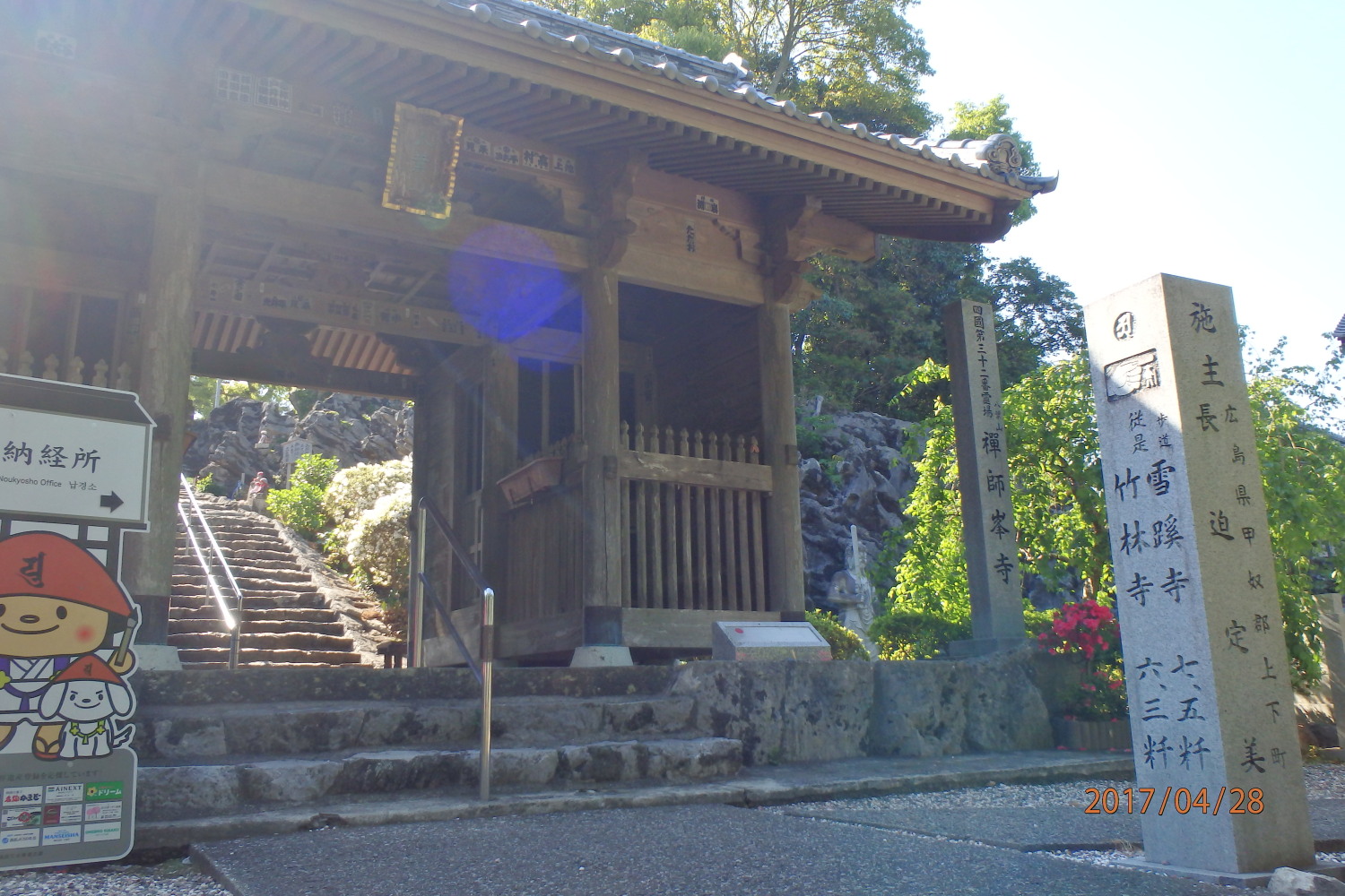 | では30番善楽寺へ向けて出立です。たぶんあちこちに案内標識があるという前提で、うろ覚えの方角を頼りに走り始めました。快晴です。善楽寺の写真はありません。広い道路に面して山門がありました。シューズをズックに換えて自転車を木立にロックし歩き始めます。長い参道を100メートル以上進むと正面に神社があり、その右手が札所でした。お賽銭と たどたどしいながらも般若心経を唱えます。あまりにも走行順路を適当に予定してきているので、自分がどこを走っているのかイメージが湧きませんでした。今日になって思いだそうとしてもやはりなお一層ムリですね。 街中を走って次は31番竹林寺です。地図が完全に頭に入っていない上、参拝するのとで結構時間がかかります。 |